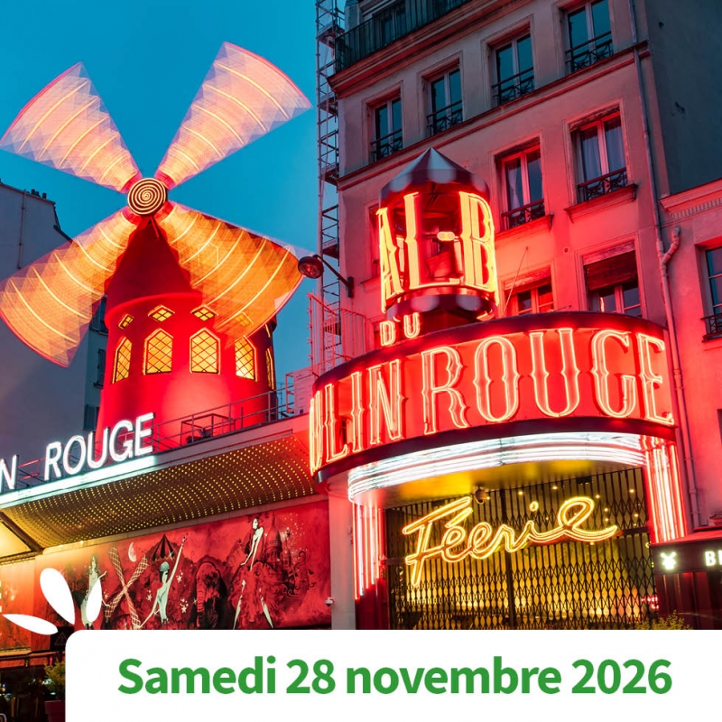 Le prix comprend : le transport, le dîner au Moulin Rouge accompagné d’une ½ bouteille de champagne/personne ou de deux boissons sans alcool et la revue « Féerie »